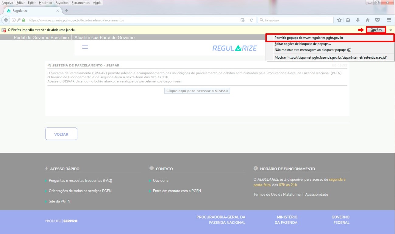Já no navegador Mozilla Firefox, o contribuinte deve clicar no botão “Opções” e em seguida selecionar “Permitir pop-ups de www.regularize.pgfn.gov.br”, como na imagem abaixo: