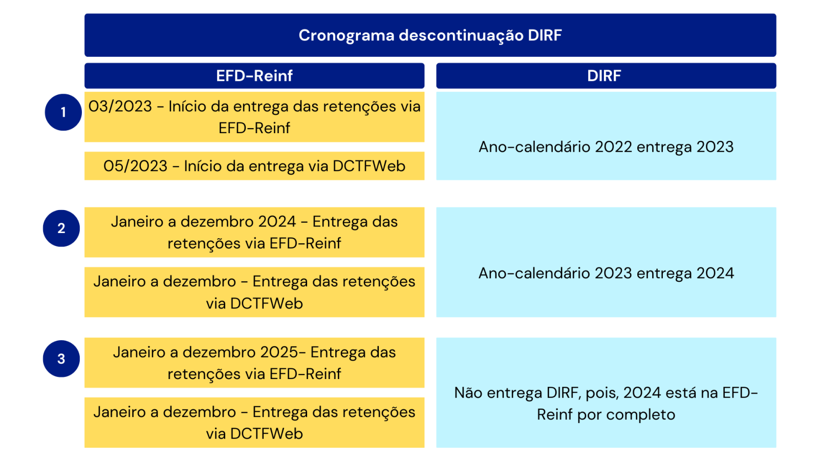 Vou explicar melhor: o cronograma de descontinuação da DIRF prevê que a declaração só poderá ser realmente dispensada quando tivermos a entrega dos dados das retenções via EFD-Reinf para um ano inteiro. Como os prazos para início dos eventos de retenções de PIS, Cofins, CSLL e IR só terão início em março de 2023, o ano-calendário de 2023 (entregue em 2024) está incompleto pela EFD-Reinf.