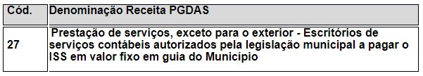 Em virtude das novas pendências decorrentes do cruzamento de informações entre os dados da Nota Fiscal de Serviços Eletrônica – NFS-e e do Programa Gerador do Documento de Arrecadação do Simples Nacional – Declaratório – PGDAS-D, verificamos que diversos escritórios de contabilidade informaram a receita de prestação de serviços utilizando o código 27 no PGDAS-D, descrito abaixo, e efetuaram recolhimentos de ISS diretamente ao município.