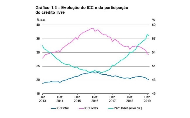 Já o Indicador de Custo do Crédito (ICC) agregado, que reflete o custo das operações de crédito sob a ótica do tomador, atingiu 20,3% em dezembro de 2019, apresentando redução de 0,1 ponto percentual em relação ao ano anterior. A decomposição do ICC mostrou queda nos componentes custos de captação e de inadimplência e elevação da margem financeira do ICC.