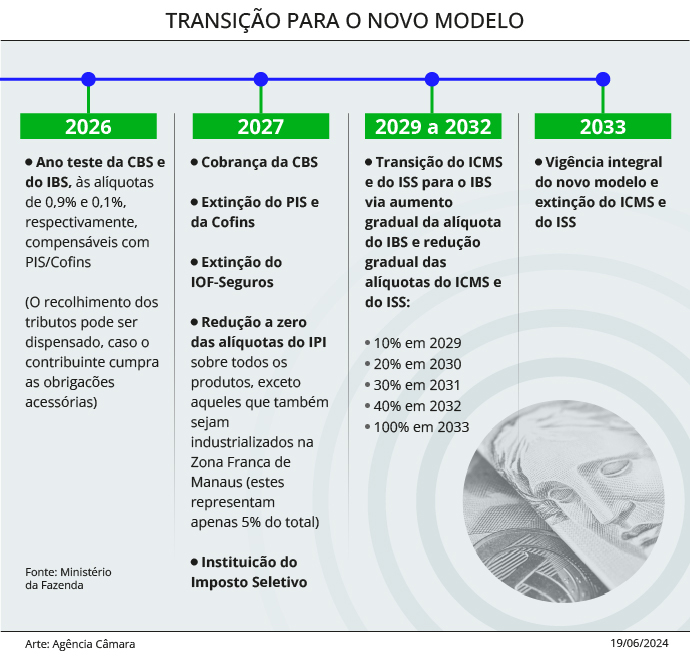 De acordo com o Projeto de Lei Complementar 68/24, que define as regras sobre incidência, base de cálculo e alíquotas dos novos tributos, o período de transição começa em 2026, quando o IBS, de competência compartilhada entre estados e municípios, e a CBS, de competência federal, serão cobrados simultaneamente com os atuais – PIS, Cofins, IPI, ICMS e ISS –, mas com alíquotas reduzidas.